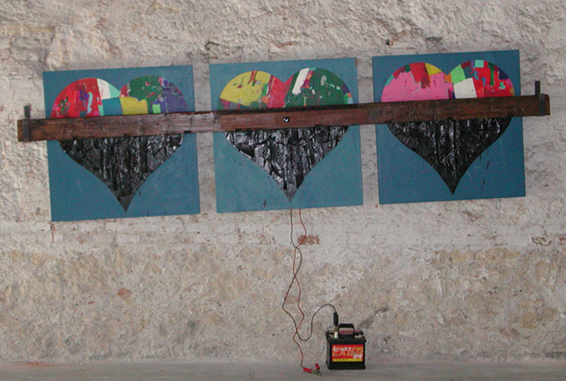 Sembra in effetti un gioco per Veneri costruire qualcosa attraverso i suoi lavori. E siccome il mio “giudizio critico” non potrà, come avrebbe potuto invece quello di Umberto Eco, sancire universalmente il valore artistico di Veneri, mi limiterò a spiegare perché a me piace, per quello che può valere, dubitando, dopo la premessa scritta da lui stesso (e me lo immagino con il suo sorriso burbero mentre la scrive) che ciò abbia una qualche importanza per lui o per qualcun altro che si imbatta in questo pieghevole. Mi piace perché attraversa linguaggi e tecniche con una libertà e un’autonomia che sono vera espressione della cultura del nostro tempo, che Veneri intuisce e restituisce, e già non è da tutti. Mi piace per il suo carattere spigliato nell’attraversare arte povera, pop, espressionismo, pittura, fotografia, poesia, elaborazione grafica, video, musica, teatro, scenografia. Mi piace perché ad una capacità di dominare, scegliere e combinare mezzi espressivi, unisce una ricerca di contenuti componendo in libertà immagini che raggiungono proprio quella parte del nostro animo che lui ha scelto come sua icona preferita, sfidando in maniera sbarazzina un topos dei più sfruttati. Se fosse tanto cattivo come vorrebbe farci credere, perché da tanti anni continuerebbe a tormentarci con i suoi cuori?